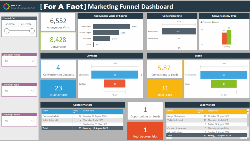 Til højre ses et eksempel på et dashboard, der viser en marketingtragt. Det kan lige så godt være en salgstragt eller noget lignende. Pointen er at gøre data synlige med udvalgte KPI’er, så salgsteamet hurtigt kan få indsigt og danne et overblik.