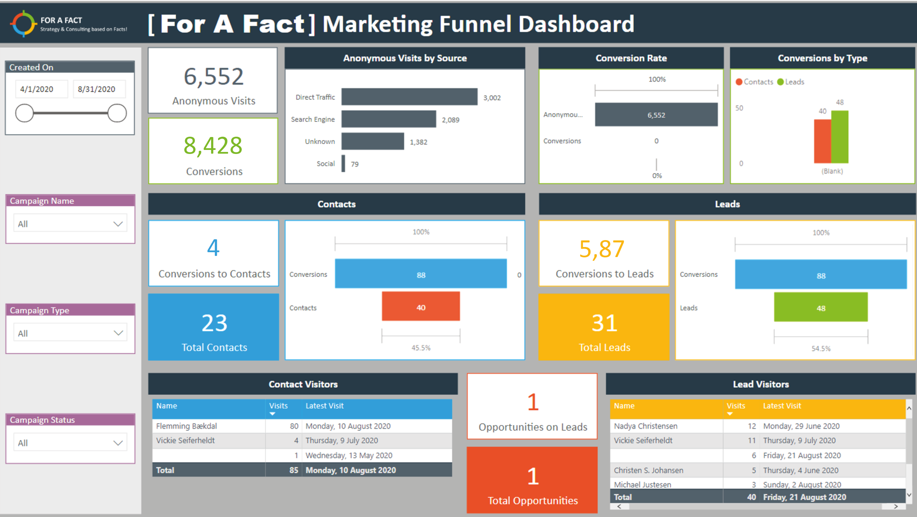 To the right, you can see an example of a dashboard displaying a marketing funnel. It could just as well be a sales funnel or something similar. The point is to make data visible using selected KPIs, so the sales team can quickly gain insight and get an overview.