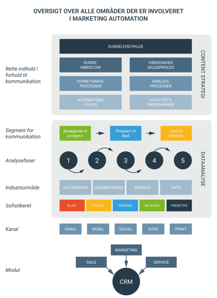 For optimal udbytte af en Marketing Automation løsning er der forskellige arbejdsområder i bør have fokus på. Marketing Automation er ikke kun et anliggende i salg eller marketing – det er et sammenspil mellem salg og marketing.